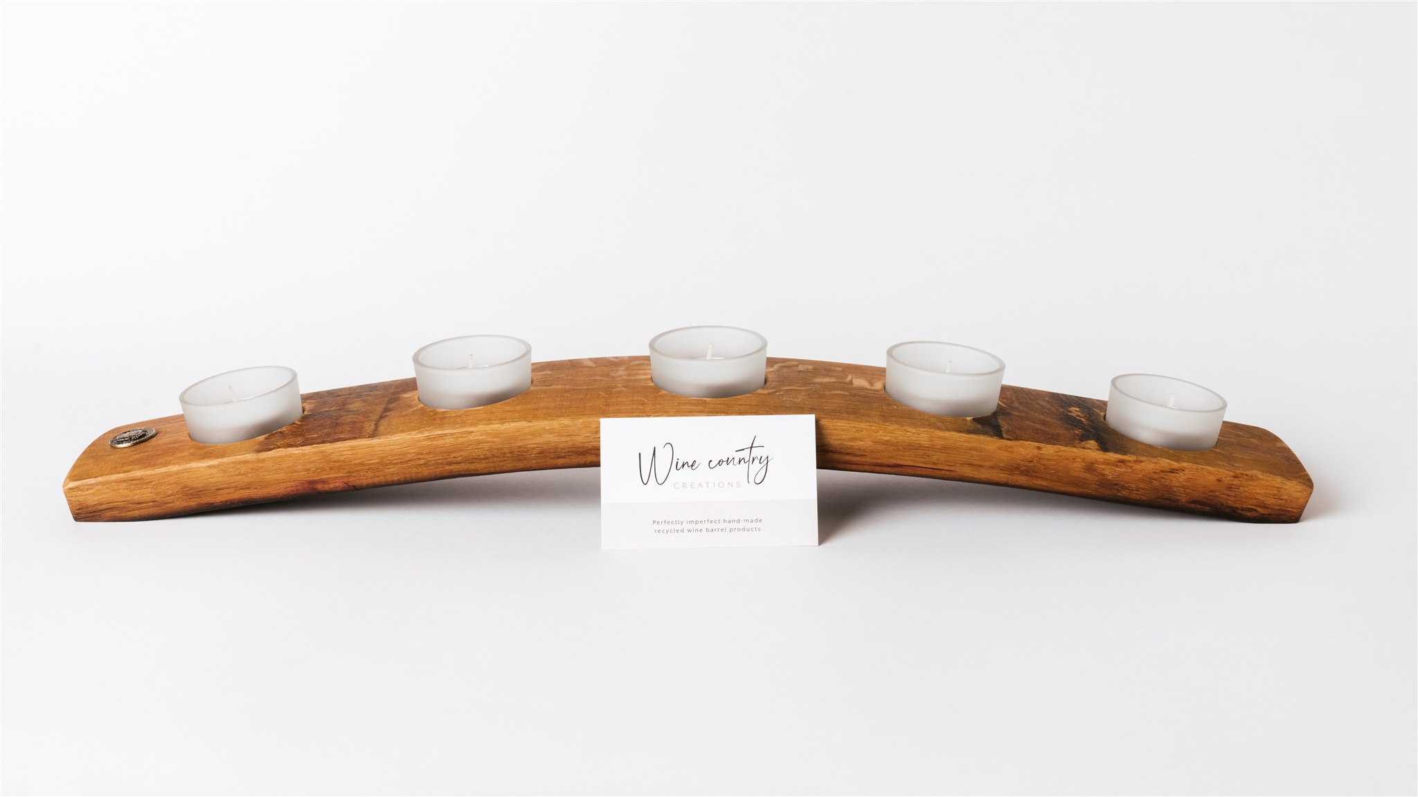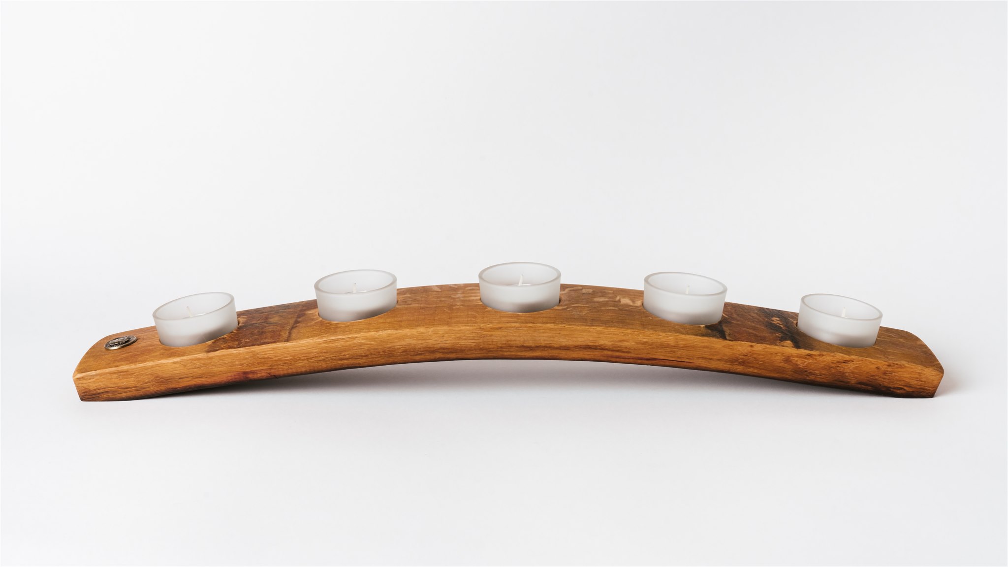 Made from the centre of a wine barrel stave with 5 removable easy to clean glass tea light holders offering some resistance to wind. Glass holders will fit either 4 or 9 hour burning tea lights.