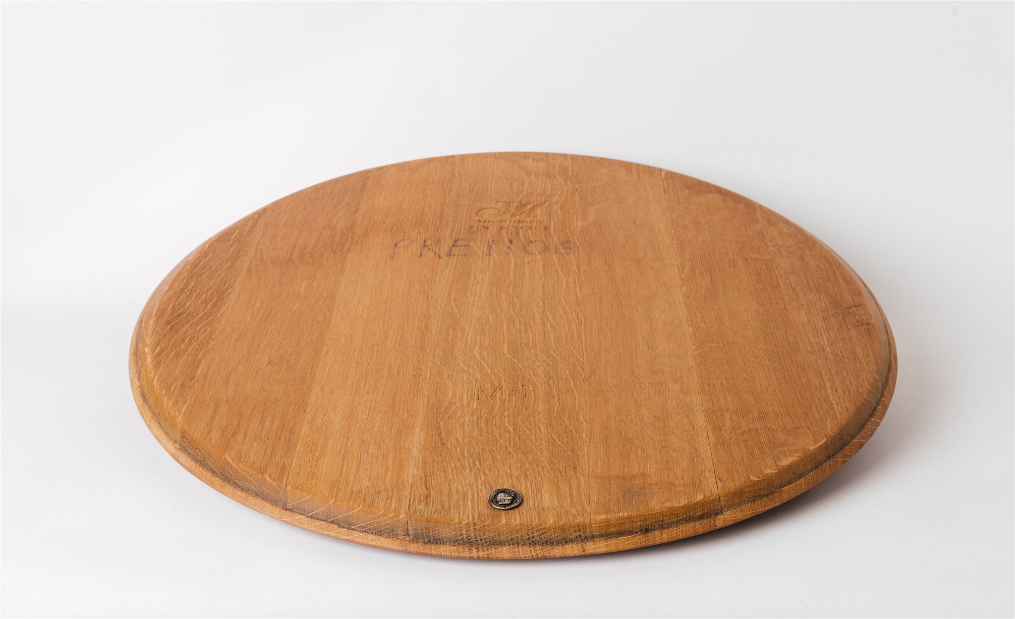 Our Signature Wine Barrel Platter made from a Wine Barrel Head, this has the barrel manufacturers unique French Stamp (may vary from that shown) and our Central Otago Antique tag at the bottom.